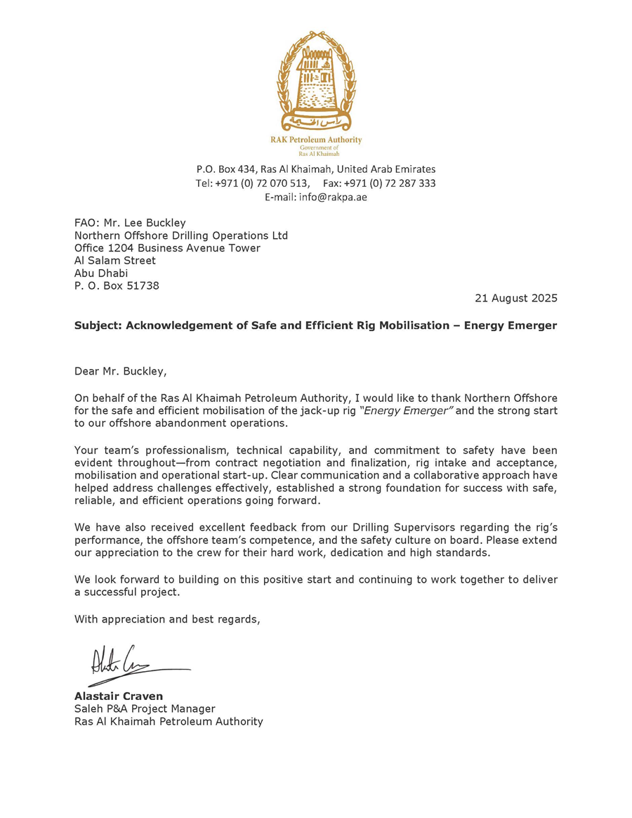 拉斯海馬石油管理局在賀信中表示,北方鉆井團(tuán)隊(duì)將專業(yè)精神、技術(shù)能力和對安全的承諾貫穿始終,不僅展現(xiàn)出穩(wěn)定的平臺性能、高效的服務(wù)水平,更彰顯了深厚的安全文化,為后續(xù)在阿聯(lián)酋海域開展鉆井作業(yè)奠定良好基礎(chǔ)。