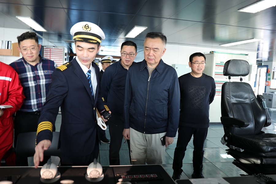 包劍英董事長實地察看了船舶工作區(qū)、貨艙、機(jī)艙、駕駛臺及船員生活區(qū),詳細(xì)了解“慧海壹號”船舶構(gòu)造和作業(yè)流程,并與船長、船員代表進(jìn)行了座談。