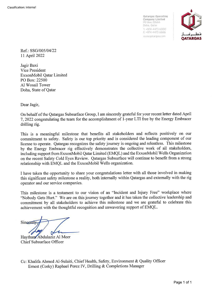 近日,公司旗下北方鉆井收到??松梨谑凸荆ㄋ枃姨烊粴夤竞献鞣剑┑馁R信,祝賀北方鉆井旗下鉆井平臺Energy Embracer取得了“一年來無損工事件”(1-year LTI free)的良好業(yè)績。