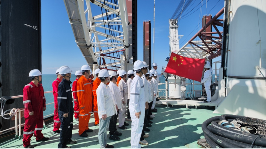 慧海風(fēng)電組織在船船員在“慧海壹號”風(fēng)電安裝船上開展“迎國慶 升國旗”活動,全體船員齊唱國歌,共同表達(dá)了對偉大祖國深沉熱愛和崇高敬意。